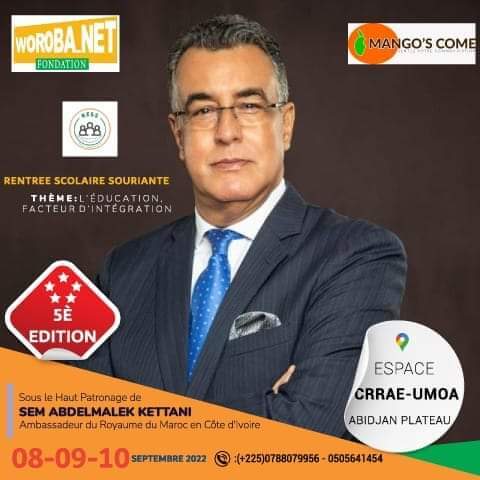 La Fondation WOROBA.NET et son partenaire MANGO’ S COME ont décidé d’innover pour l’organisation de la Rentrée Scolaire Souriante (RESS) qui doit se tenir du 8 au 10 septembre 2022 à l’espace CRRAE-UMUOA au Plateau (Abidjan-Côte d’Ivoire), sous le thème : « L’EDUCATION, FACTEUR D’INTEGRATION ».